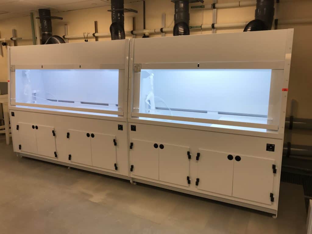 Fume hoods are designed to draw polluted air away from the work space and into an exhaust system. The air is then expelled through the exhaust system into a separate space away from employees.