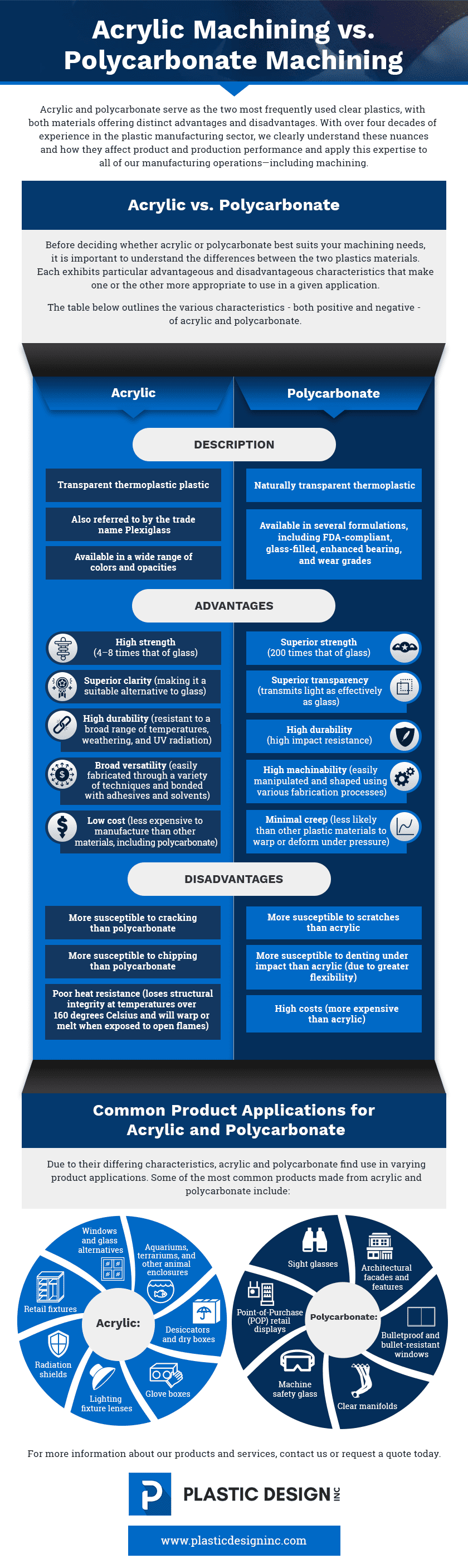 Before deciding whether acrylic or polycarbonate best suits your machining needs, it is important to understand the differences between the two plastics materials. Each exhibits particular advantageous and disadvantageous characteristics that make one or the other more appropriate to use in a given application.