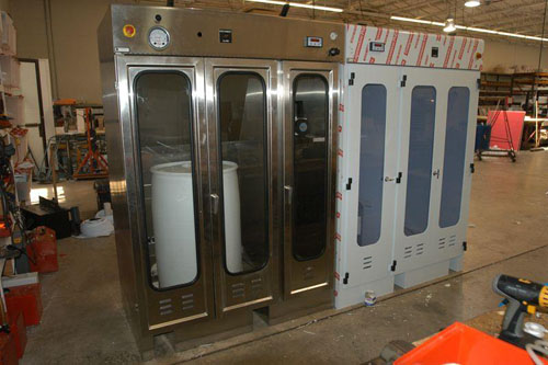 To allow for the safe and effective cleaning of hazardous chemical containers, Plastic Design Industries offers automatic bottle washing systems with built-in cap washers to clean container caps. Our equipment can handle up to 12 one-gallon containers at once.